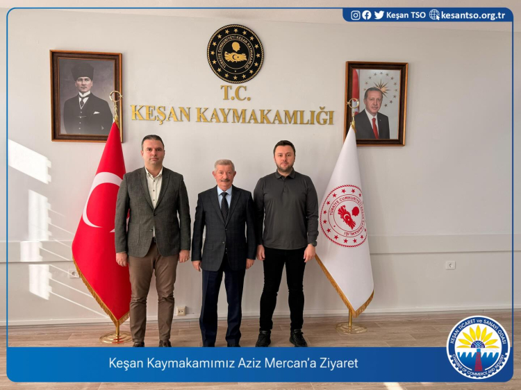 Erdoğan DEMİR / EDİRNE (İGFA) – Edirne’de Keşan Ticaret ve Sanayi Odası Yönetim Kurulu Başkanı İsmail Şapçı ve Genel Sekreter Erdem Başak, Keşan Kaymakamı Aziz Mercan’ı makamında ziyaret etti. Gerçekleştirilen ziyarette; Keşan ve bölgesinin ticaret, sanayi, tarım ve turizm alanlarındaki mevcut durumu ele alınırken, üyelerden gelen istek, talep ve çözüm önerileri değerlendirildi.